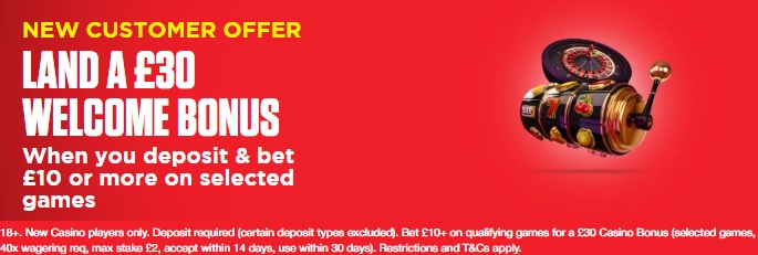 Terms: 18+. New Casino players only. Deposit required (certain deposit types excluded). Bet £10+ on qualifying games for a £30 Casino Bonus (selected games, 40x wagering req, max stake £2, accept within 14 days, use within 30 days). Restrictions and T&Cs apply.